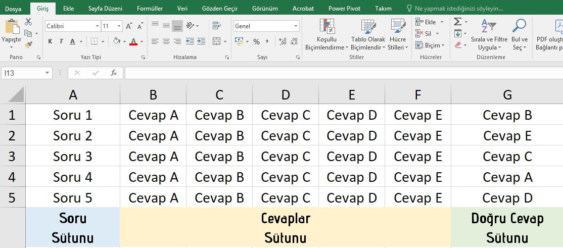 Sorularınızı örnekteki gibi excel dosyası olarak hazırlayıp buraya yükleyin. Doğru cevap ile cevap birebir aynı olmalıdır.